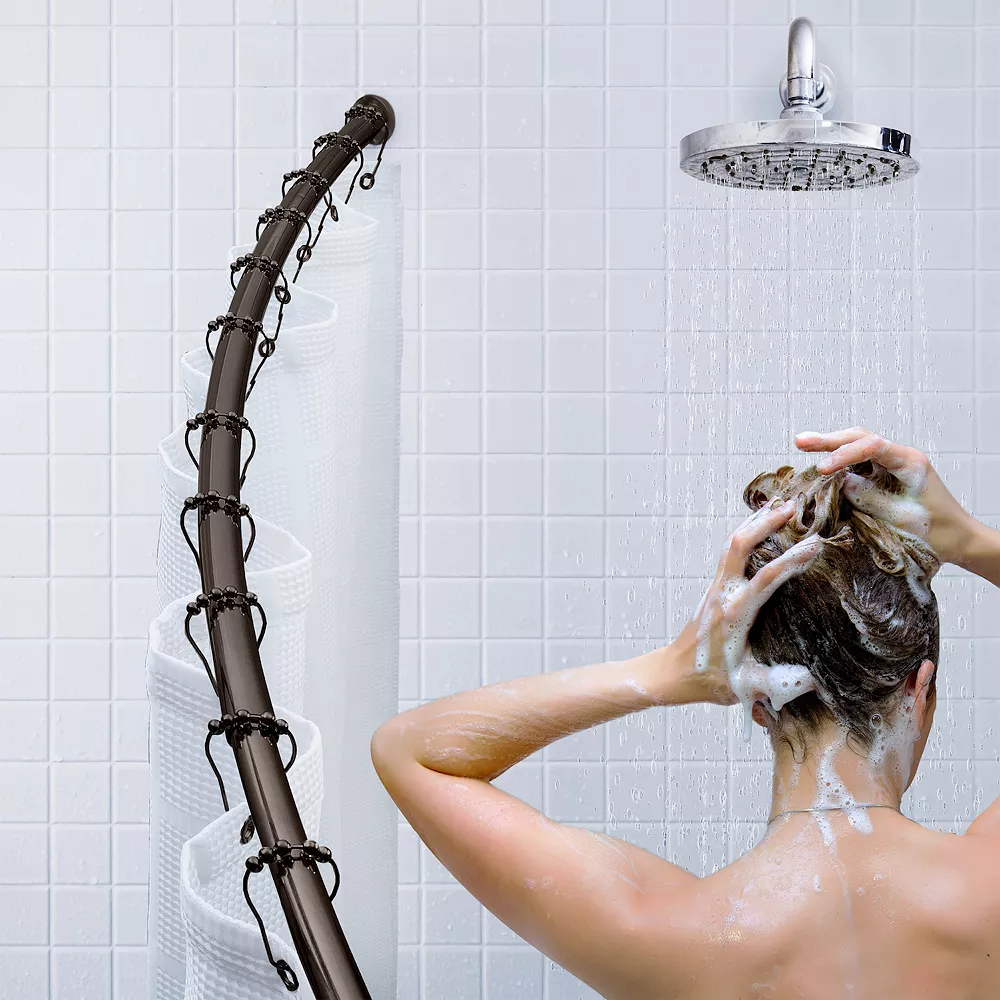 Update your bathroom with this pretty Bath Bliss curved shower rod.
