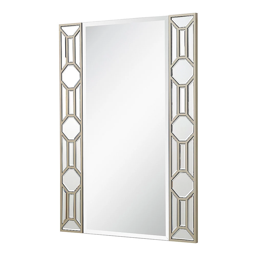 The Lilian Mirror is perfect for clients who enjoy modern style with a kick. The octagonal mirrors along the front take this console to new heights. Bring the Lilian Mirror home today and add amped-up modern flair to your space today. Octagonal mirrors add depth to this mirrored piece. Champagne painted wood frame. Framed on two sides for an elongated look. Hangs either direction to make the statement you want. Coordinates with Lilian Console Table. Surface Shape: Flat. Purposeful Distressing Type: No Distressing. Mirror Height – Top to Bottom: 34.6. Mirror Width – Side to Side: 16. Largest Dimension: 34.6. Trend: Casual. Size: Large (3O-in to under 5O-in H). Edge Type: Beveled. Mounting Bracket Included: Yes. Mounting Hardware Included: No. Tilting: No. Shelf Included: No. Wood Species: Pine.