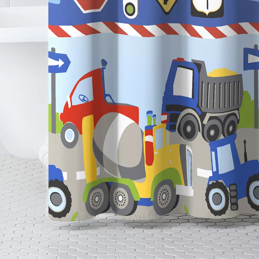 - Inspired by your little one’s favorite vehicles, the Dream Factory Trains and Trucks shower curtain will get them excited about bath time. Bustling trucks and tractors move across the face of this shower curtain to add adventure to the bathroom. Your child will even recognize some of their favorite street signs navigating all of the dashing vehicles. The bright and playful look will keep your little one in awe even after a long day of play.