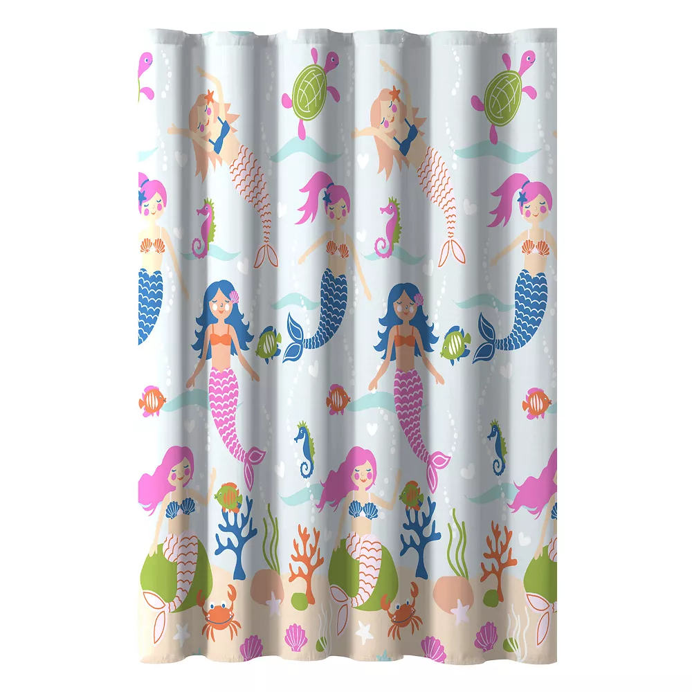 - Say hello to the mermaid friends and dive into the magical wonders of the sea. Dress your child’s bathroom with the under the sea adventure that they imagine. On the ocean floor your little one will find dancing crabs and seashells in this coral reef. Cheerful pink, blue, and orange tailed mermaids swim across this shower curtain with fish, sea horses, and sea turtles. This fun statement is just what the bathroom needs to refresh your child’s space.