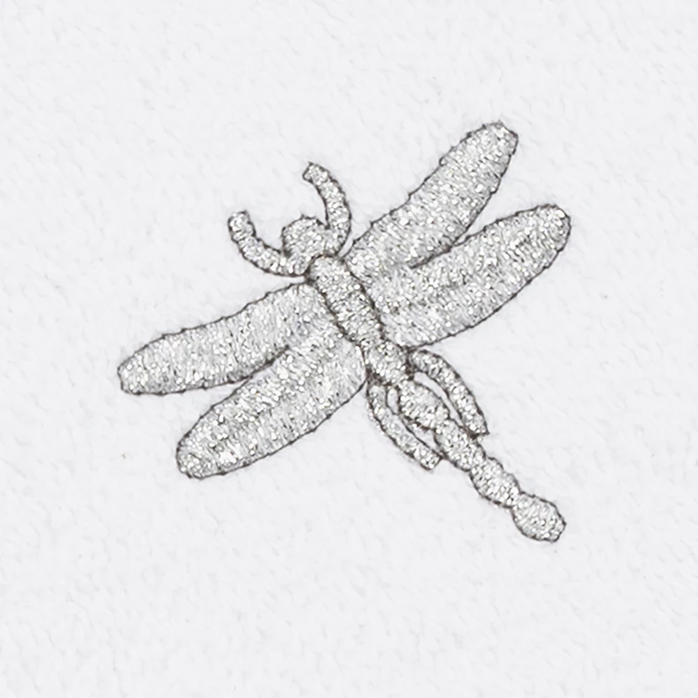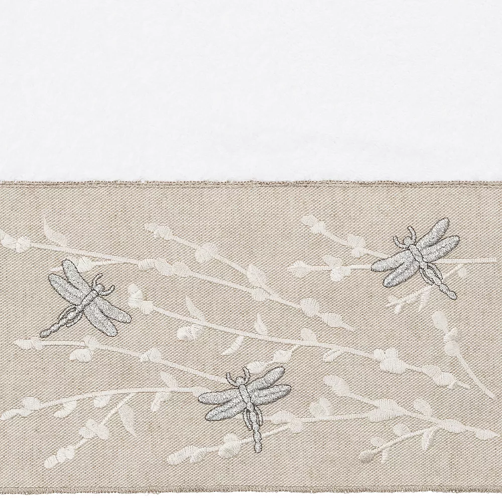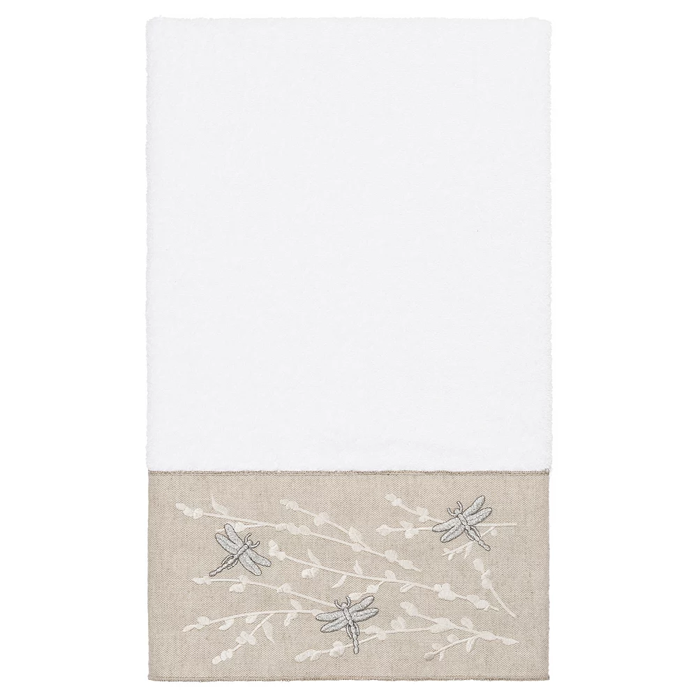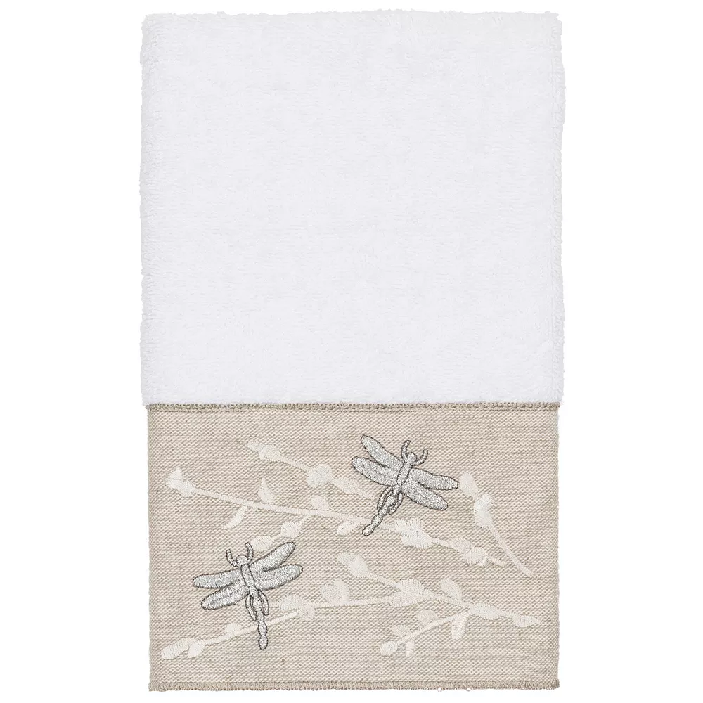 - The Braelyn Embellished Towel Collection features glittering dragonflies flying among delicate branches embroidered on a linen-look textured woven cloth border.
