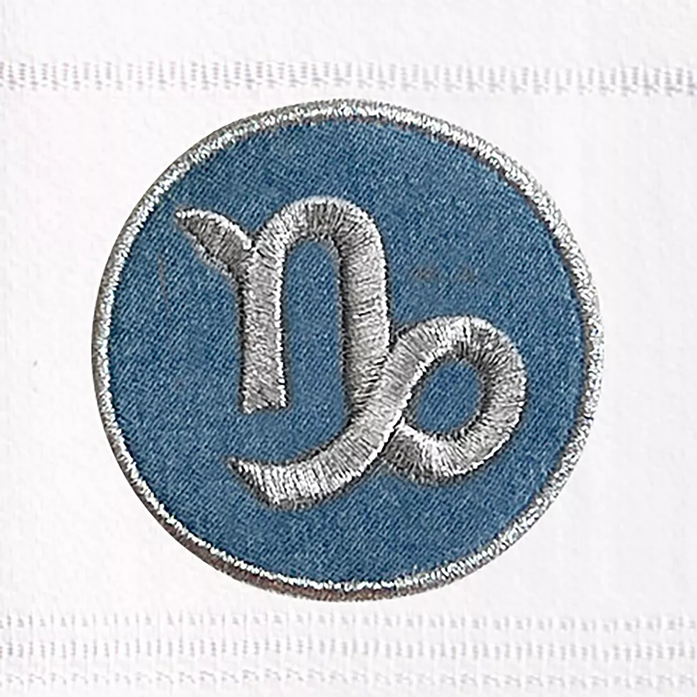 - Features your sparkling metallic horoscope sign embroidered on a washed denim applique