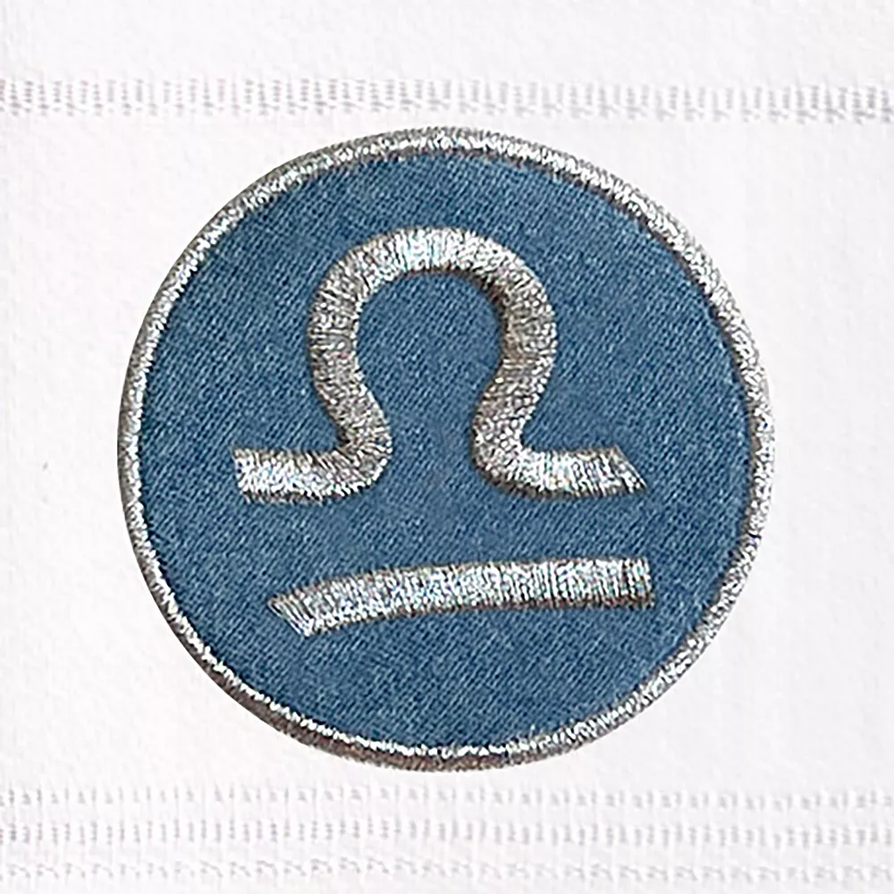 - Features your sparkling metallic horoscope sign embroidered on a washed denim applique