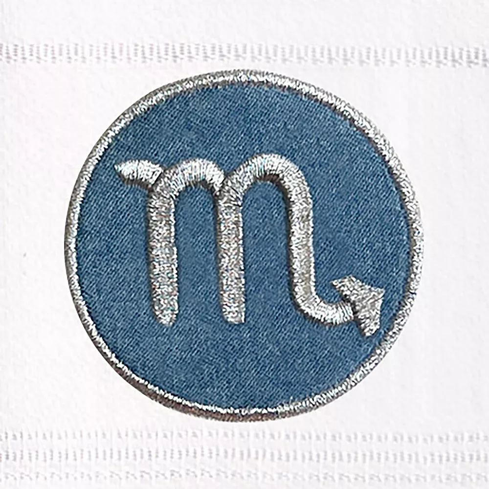 - Features your sparkling metallic horoscope sign embroidered on a washed denim applique