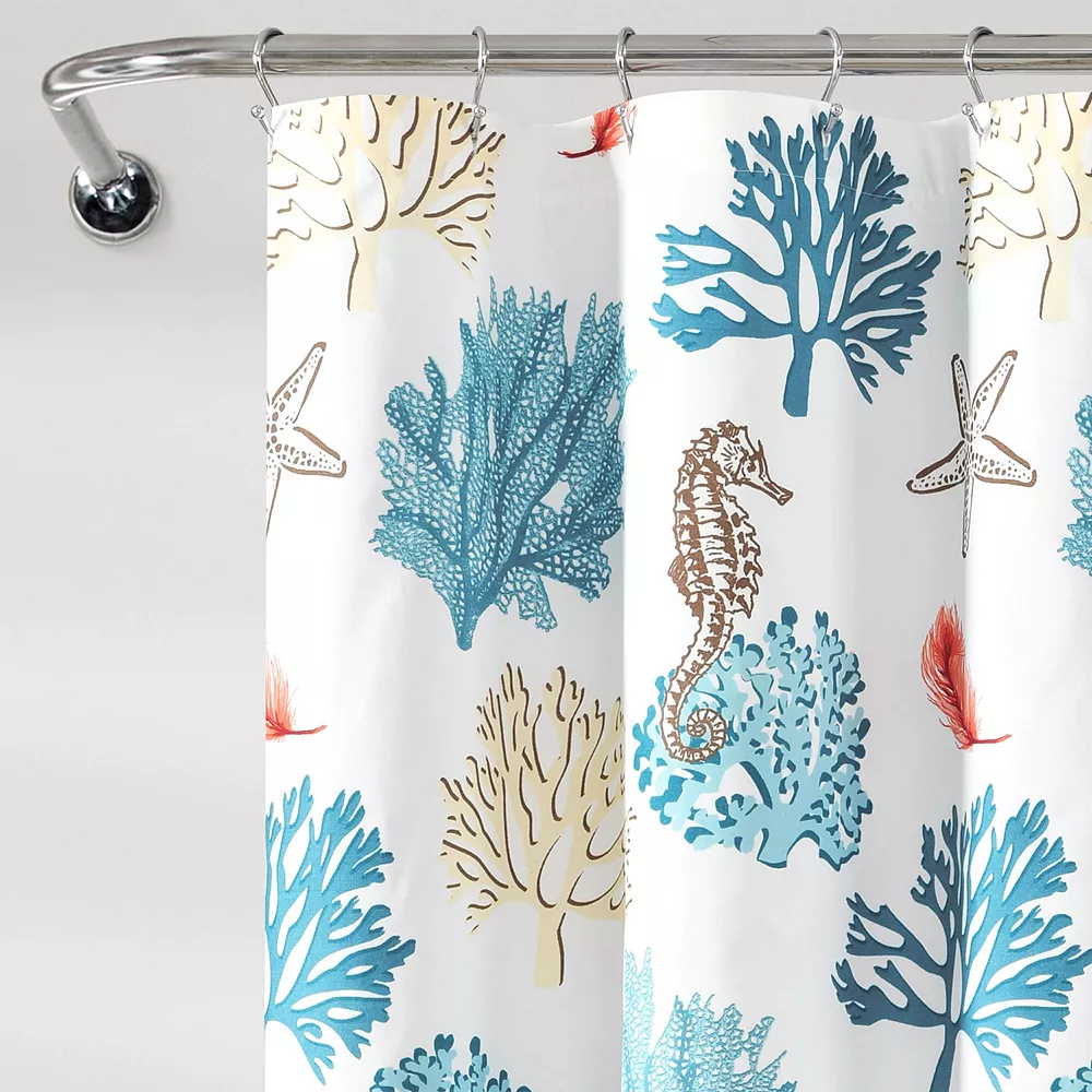 - Upgrade your master or guest bathroom with this colorful coastal style shower curtain featuring reefs, feathers and sea life.