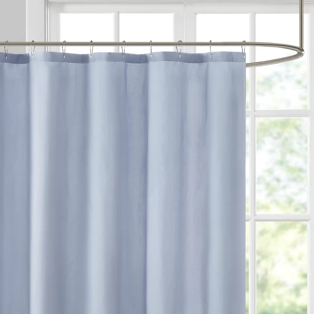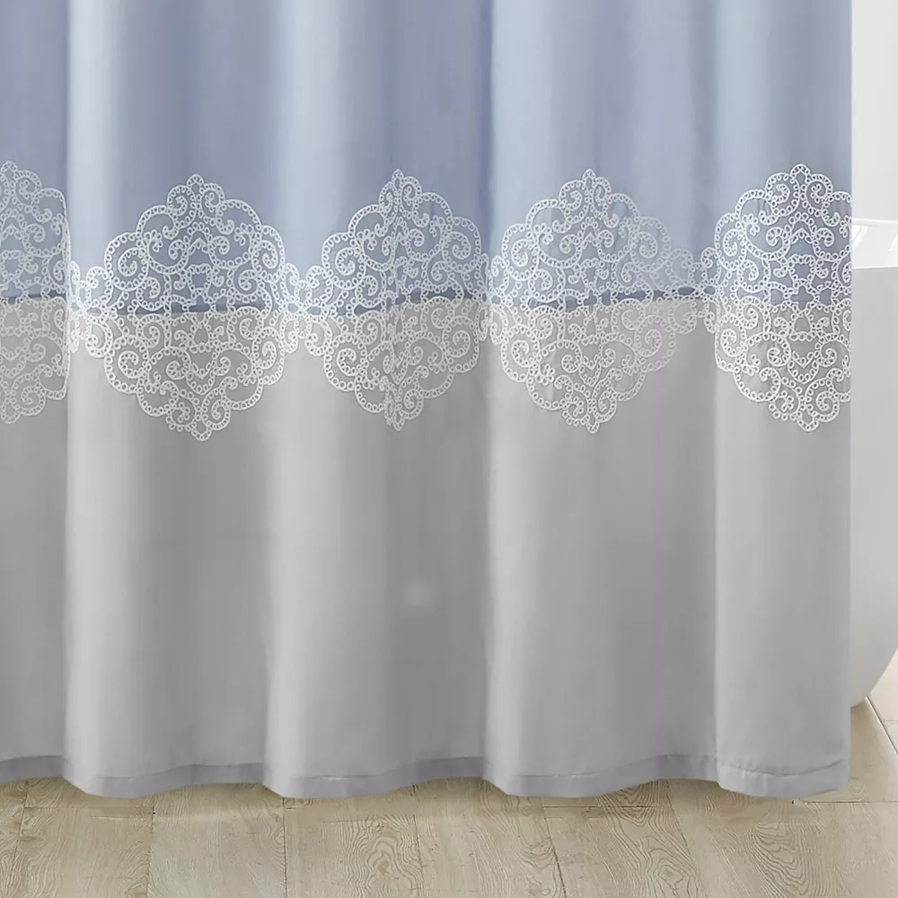 The Madison Park Vera transitional shower curtain combines a colorblock design with lattice embroidery for a beautiful and stylish addition to your bathroom decor.