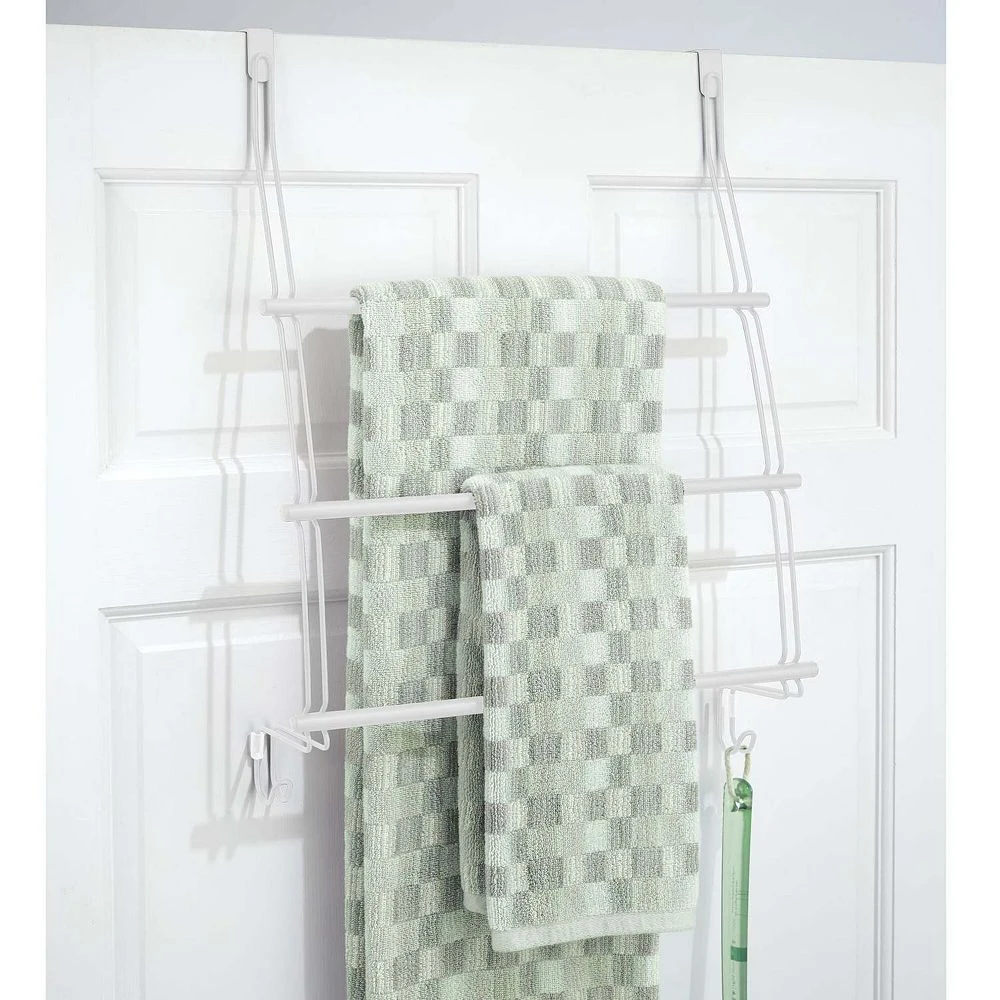- 3 LEVEL STORAGE: Three towel bars and two hooks hold and store towels, loofahs, sponges, robes and other bathroom accessories