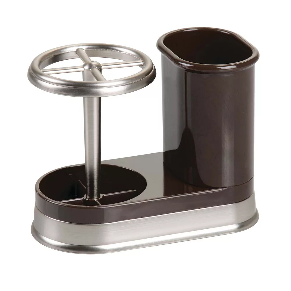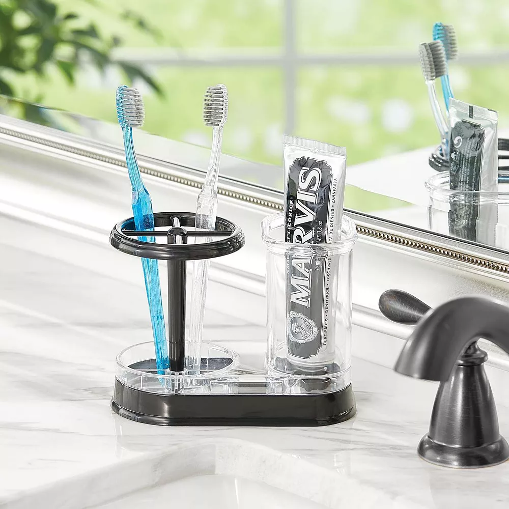 Keep bathroom counters and vanities organized and clutter free with the Toothbrush and Toothpaste Center from mDesign. The toothbrush holder has room to hold four toothbrushes and the raised edge around the base keeps them from shifting out of place. You’ll always have toothpaste nearby with the attached container – it’s also perfect for storing makeup brushes! The slim design easily fits on bathroom vanities and counters, or for more discreet storage stash out of sight in a medicine cabinet!