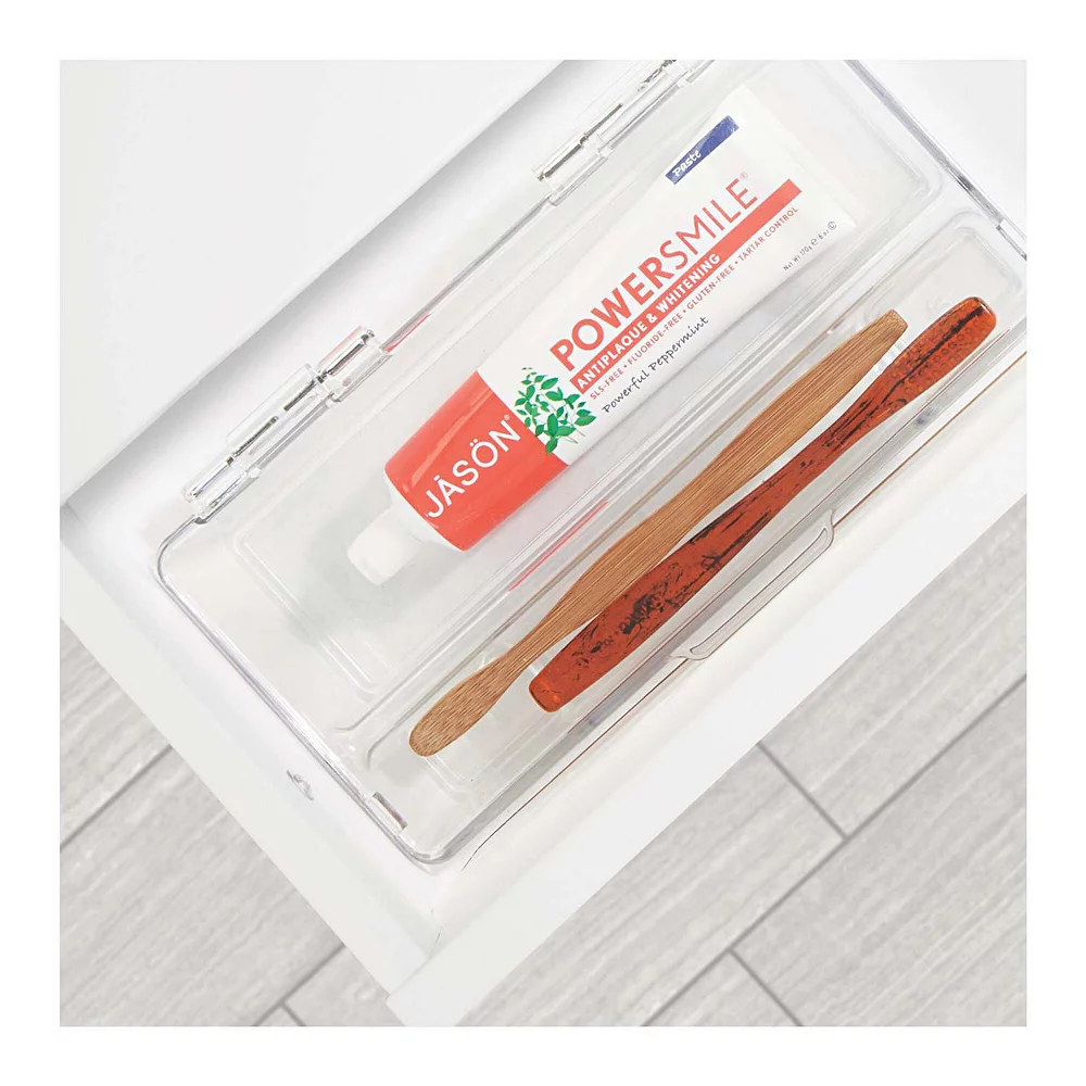 Streamline and organize bathroom cabinets and counter tops with the mDesign Bathroom Toothbrush Holder. This storage organizer is a great way to sort all of your bathroom and dental supplies. The divided compartments easily hold toothbrushes, toothpaste and dental floss with ease. The hinged lid keeps your items clean and allows bins to be stacked to take advantage of vertical space. Also fits in most standard drawers. Keep your essentials organized and tidy. mDesign – more calm, less clutter