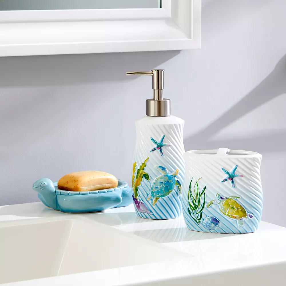 Give your bathroom a fun, underwater theme with this watercolor ocean soap pump.