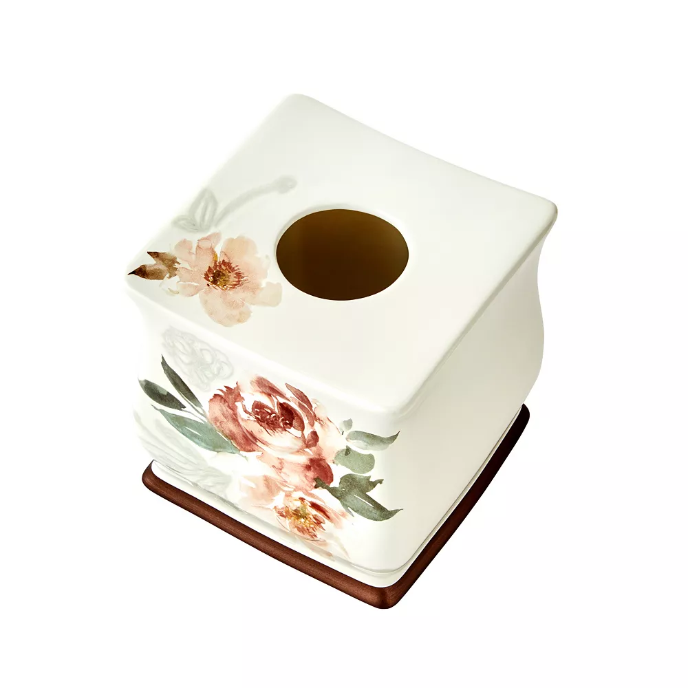 - The glazed tissue holder features a watercolor-like floral design and antique bronze trim. It discreetly covers a standard tissue box and creates an organized, clean look in your bathroom.