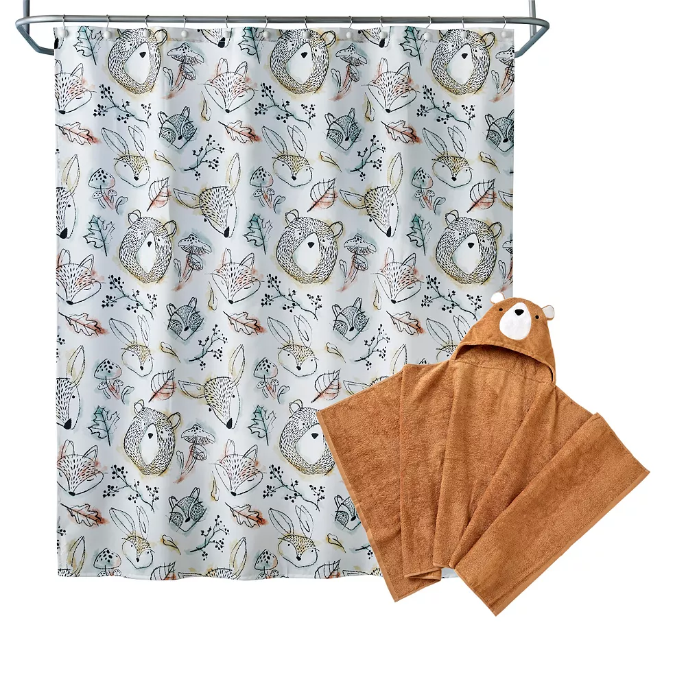 Bring the outdoors in with this stylish wooldand-themed shower curtain and hooded towel set from SKL Home.