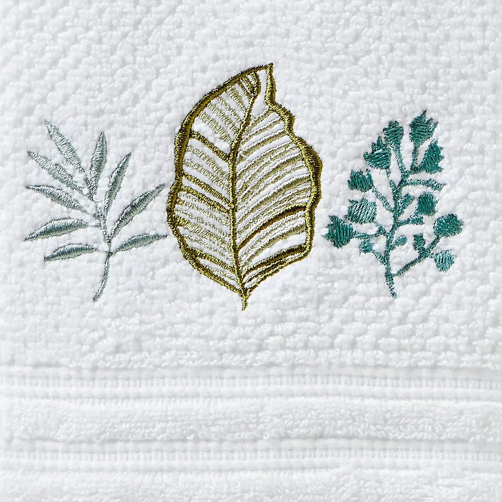 - Soft and absorbent, the 2-piece hand towel set is made of plush terry with a unique dobby weave and features tropical leaf embroidery in various shades of green.