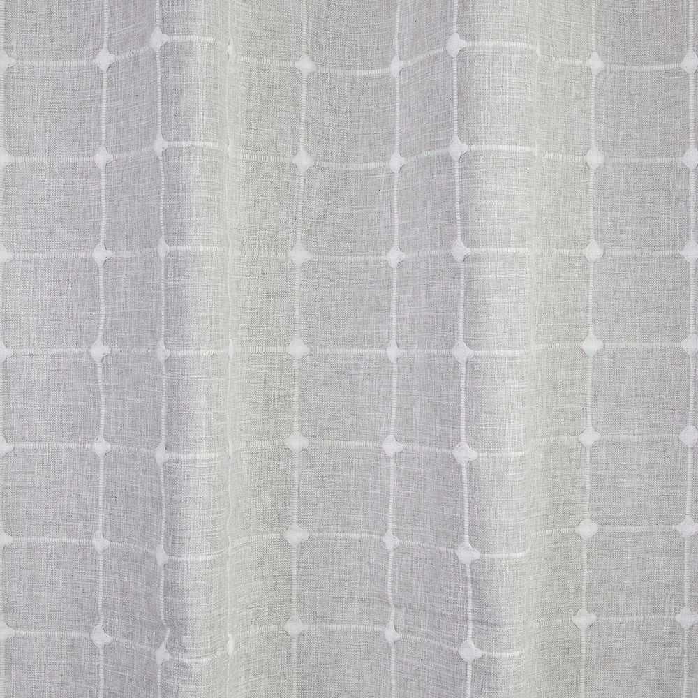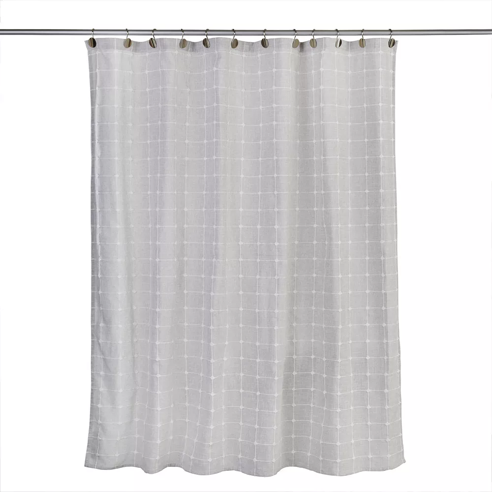 - Keep things neutral. This neutral woven shower curtain features a windowpane grid-like pattern with textured center dot. 12-button holes line the top for easy hanging. Use of a liner is recommended; liner/hooks not included.
