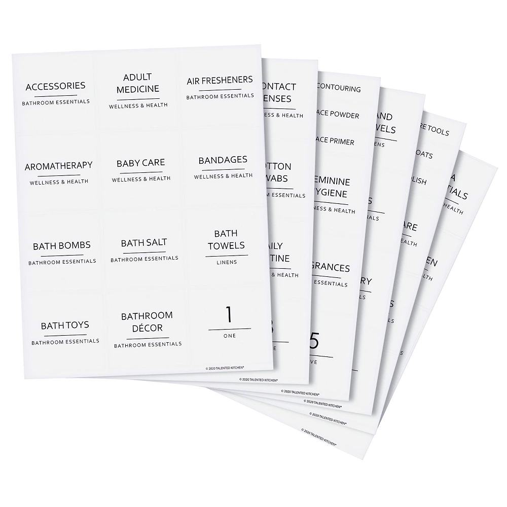 - Medicine Cabinet Labels: Create a picture-perfect bathroom with this set of 174 preprinted bathroom organization labels; the clear rectangular stickers include commonly used products, such as makeup, hair styling tools, dental care, fragrances, first-aid, grooming items, creams, lotions, shampoo, conditioner, toiletries, vitamins, and more