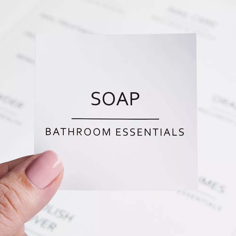 - Jar Labels for Pantry: Our preprinted minimalist style bathroom labels for containers feature bold black text against a clear background; the rectangular stickers are perfect for glass canisters, acrylic containers, ceramic jars, and other food storage and pantry organization solutions