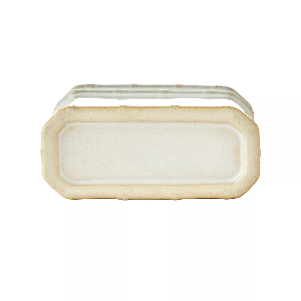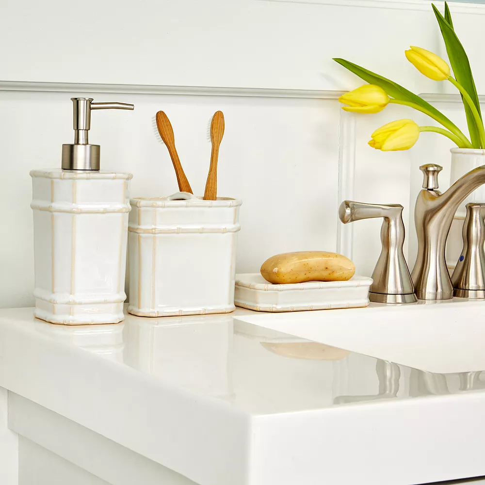 - This sculpted design, in tonal ecru, features a glazed finish and ribbed accents. It can accommodate manual or standard electric toothbrushes.